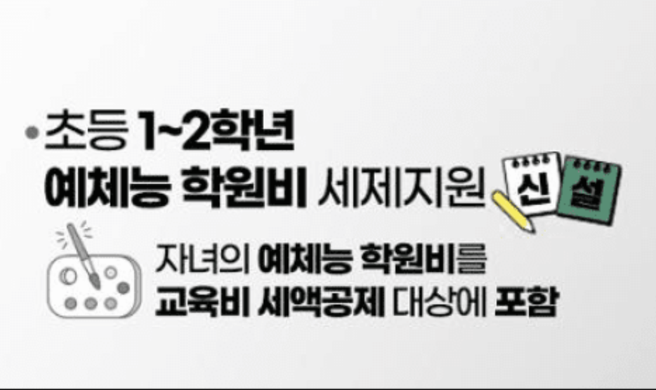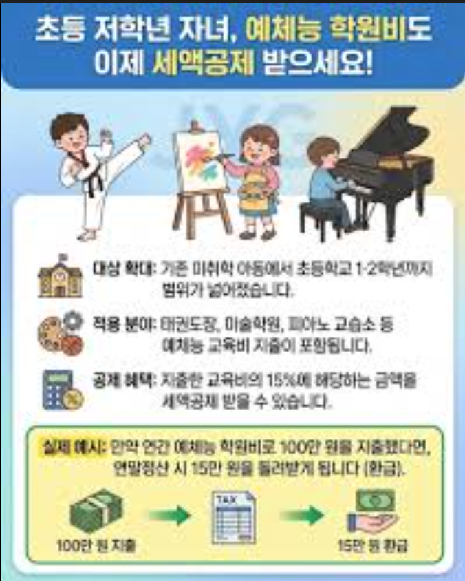 기존에는 취학 전 아동의 유치원·어린이집 비용과 일부 학원비만 세액공제가 가능했지만, 이제는 초등학교 1~2학년 자녀의 예체능 학원비까지 포함됩니다.