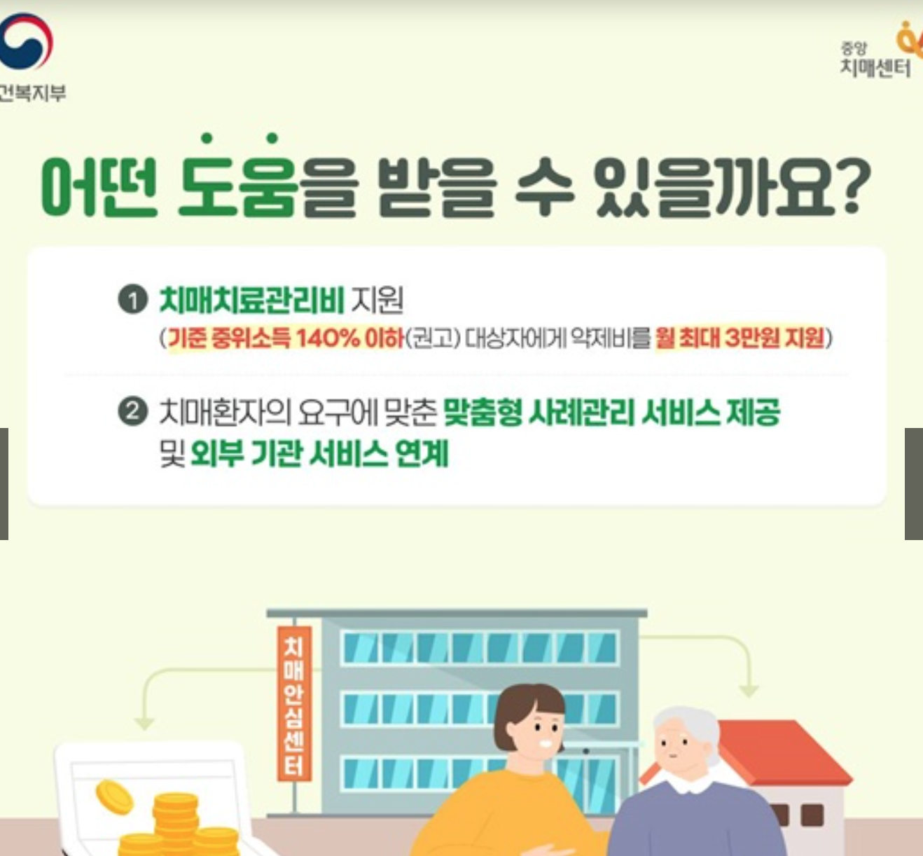 치매 진단 시, 환자와 가족에게 맞춤형 돌봄 서비스와 사례관리자가 배정됩니다.