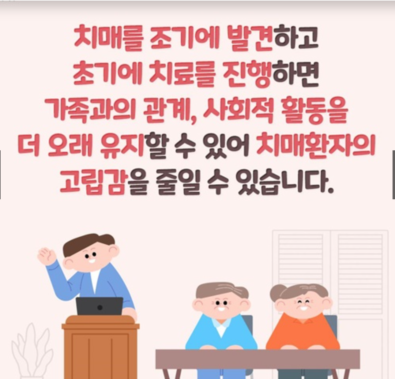치매는 아직 완치가 어려운 질환이지만, 조기 발견 시 진행을 늦추고 관리가 가능하기 때문에 훨씬 더 나은 삶을 기대할 수 있습니다.