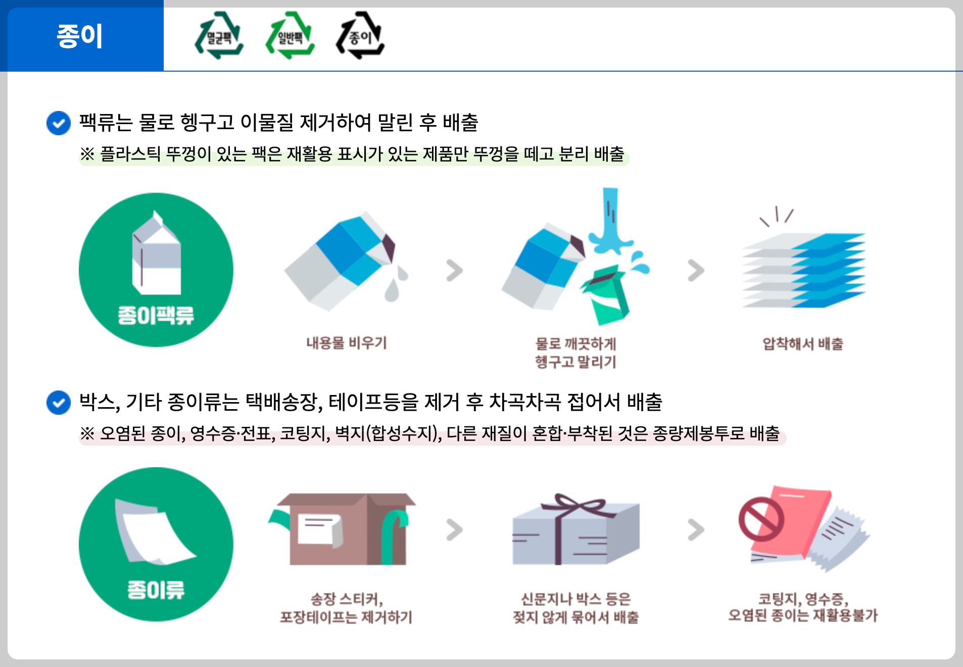 종이류는 깨끗한 상태여야만 재활용이 가능합니다. 종이박스는 테이프를 제거하고 평평하게 접어 배출합니다.