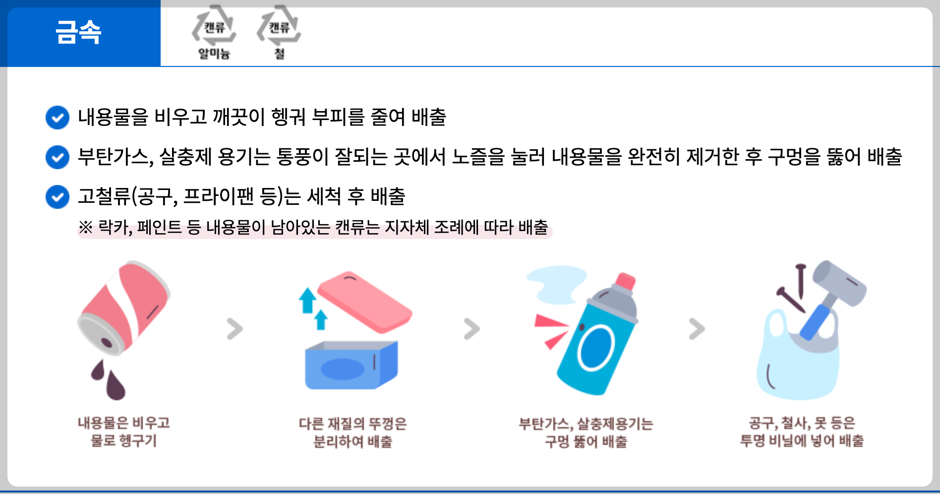 캔·고철류는 음료캔이나 식품 캔을 비우고 가볍게 헹군 뒤 배출합니다.