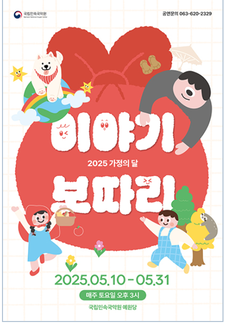 어린이 체험형 국악극 <별이와 무지개다리> 공연명 2025 가정의 달 <이야기 보따리> 기획공연 공연종류 어린이 공연기간2025-05-10 ~ 2025-05-31 관람시간 2025-05-10(토) 15:00 ~ 16:10 2025-05-17(토) 15:00 ~ 16:00 20